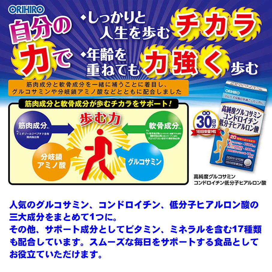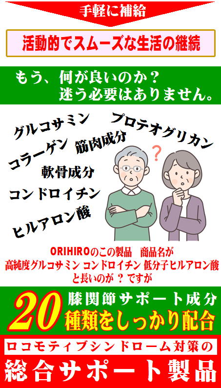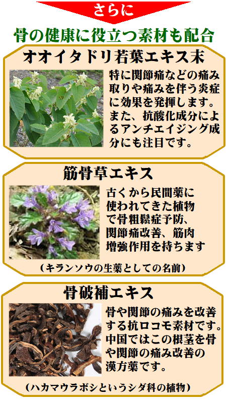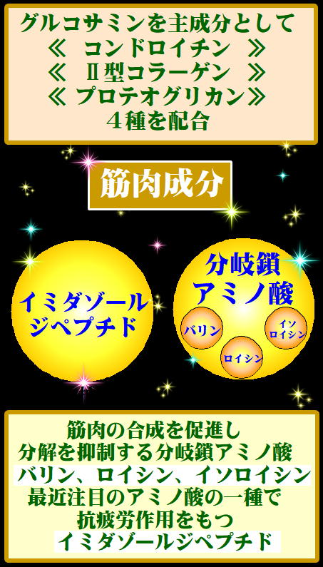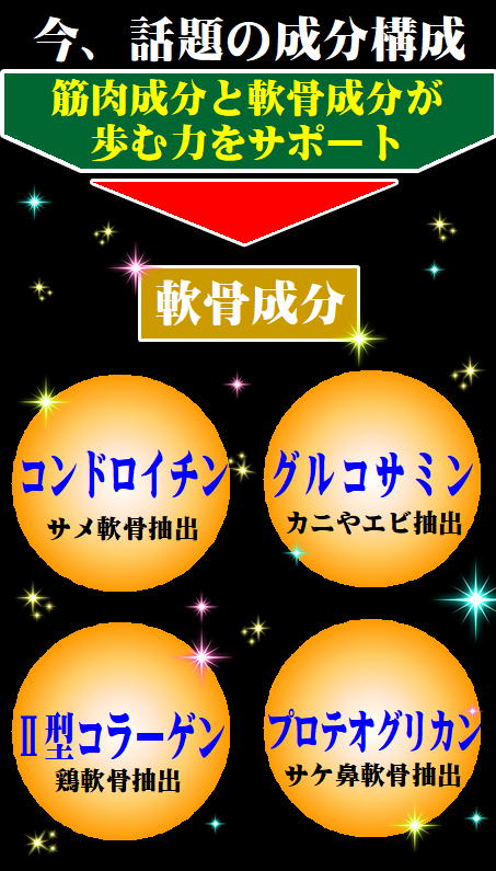 サメ軟骨抽出物、コラーゲンペプチド(ゼラチンを含む)、デキストリン、 鶏軟骨抽出物、鶏肉抽出物、 オオイタドリ若芽 エキス末、骨砕補エキス末、亜鉛含有酵母、大豆胚芽抽出物、サケ鼻軟骨抽出物 グルコサミン(えび・かに由来)、結晶セルロース、ロイシン、ショ糖脂肪酸エステル、貝Ca 、バリン、イソロイシン、酸化 Mg 、二酸化ケイ素、ヒアルロン酸、ヘスペリジン、 V.B 1 、 V.B 6 、 VD