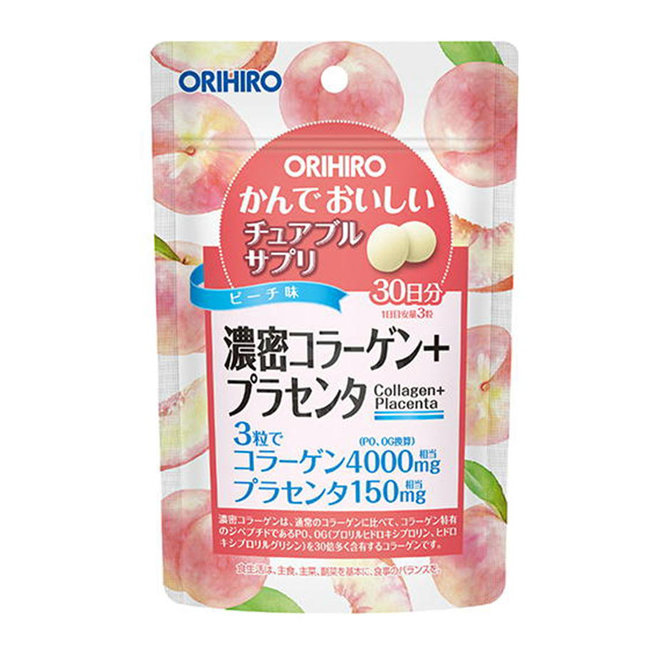 【原材料】 砂糖(国内製造)、麦芽糖、フィッシュコラーゲンペプチド(ゼラチンを含む)、ピーチパウダー、豚プラセンタエキス末/結晶セルロース、ショ糖脂肪談エステル、酸味料、甘味料(アスパルテーム・L-フェニルアラニン化合物、スクラロース、アセスルファムK) 【栄養成分表示/製品3粒当たり】 熱量6kcal、たん白質0.14g、脂質0.05g、炭水化物1.25g、食塩相当量0~0.01g コラーゲンペプチド135mg(コラーゲン4000mg相当/PO、OG換算)、プラセンタエキス末3mg(プラセンタ150mg相当)