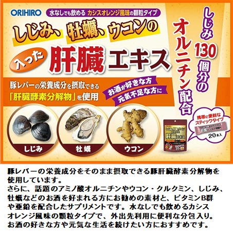 本品には豚レバーの栄養成分をそのまま摂取できる豚肝臓酵素分解物を使用しています。さらに、話題のアミノ酸オルニチンやウコン・クルクミン、しじみ、牡蠣などのお酒を好まれる方におすすめの素材、ビタミンB群や亜鉛を配合したサプリメントです。水なしでも飲めるカシスオレンジ風味の顆粒タイプで、外出先での利用にも便利な分包入り。お酒を飲む機会の多い方や疲れが気になる方の日頃の健康管理にお役立て頂けます。